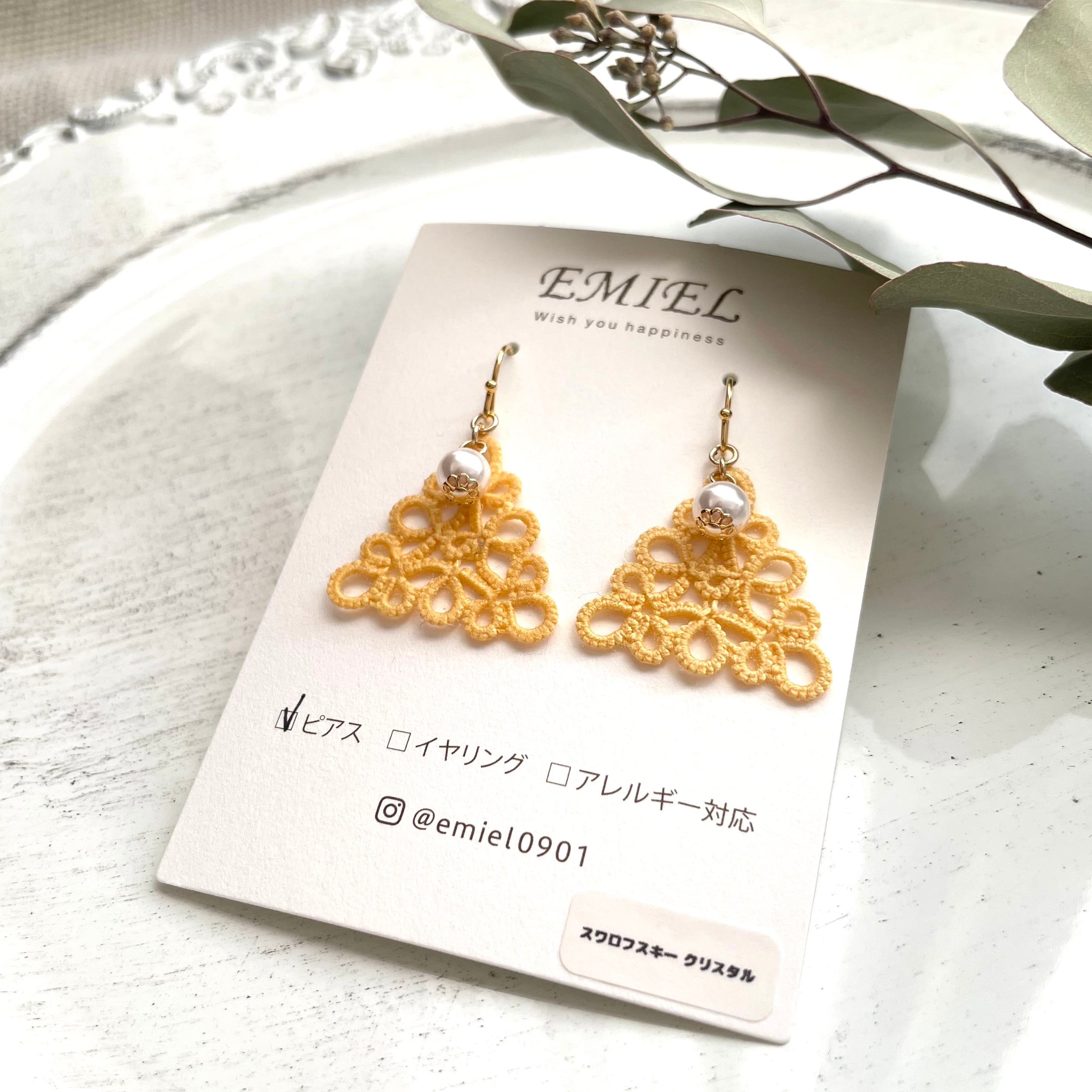 三角モチーフ*くちなし色タティングレースのピアス・イヤリング