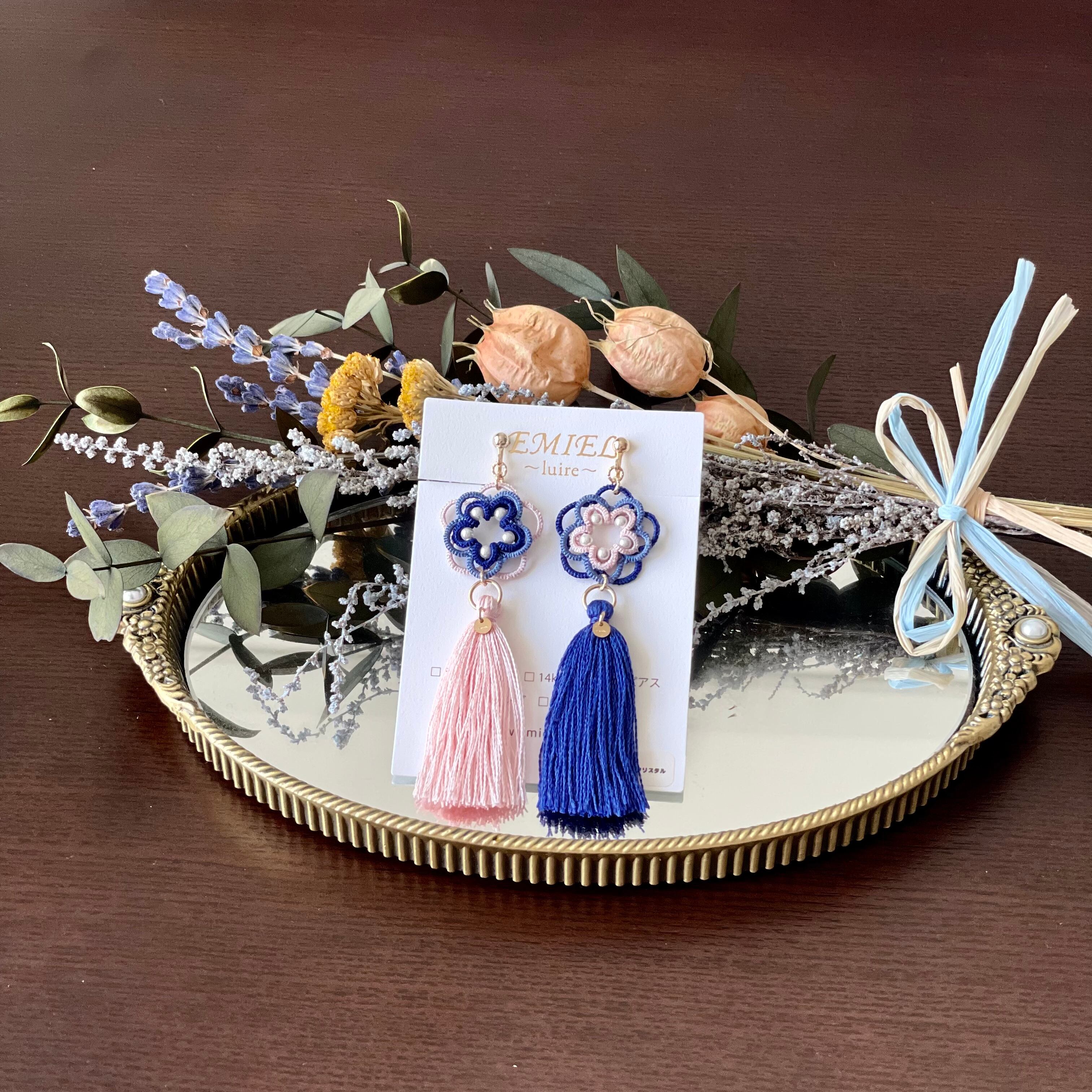Kibou〜luire〜シルク糸*瑠璃・白梅・み空色レースのタッセルピアス・イヤリング▶︎14kgf使用*国内送料無料