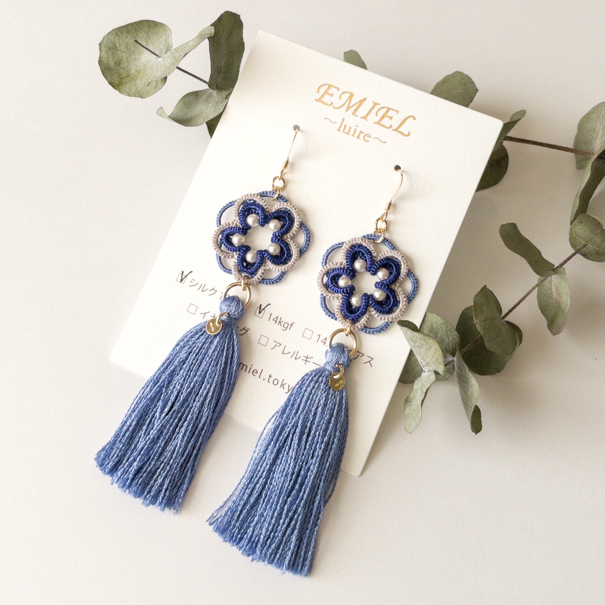 Kibou〜luire〜シルク糸*み空・瑠璃・亜麻色レースのタッセルピアス・イヤリング▶︎ 14kgf使用*国内送料無料