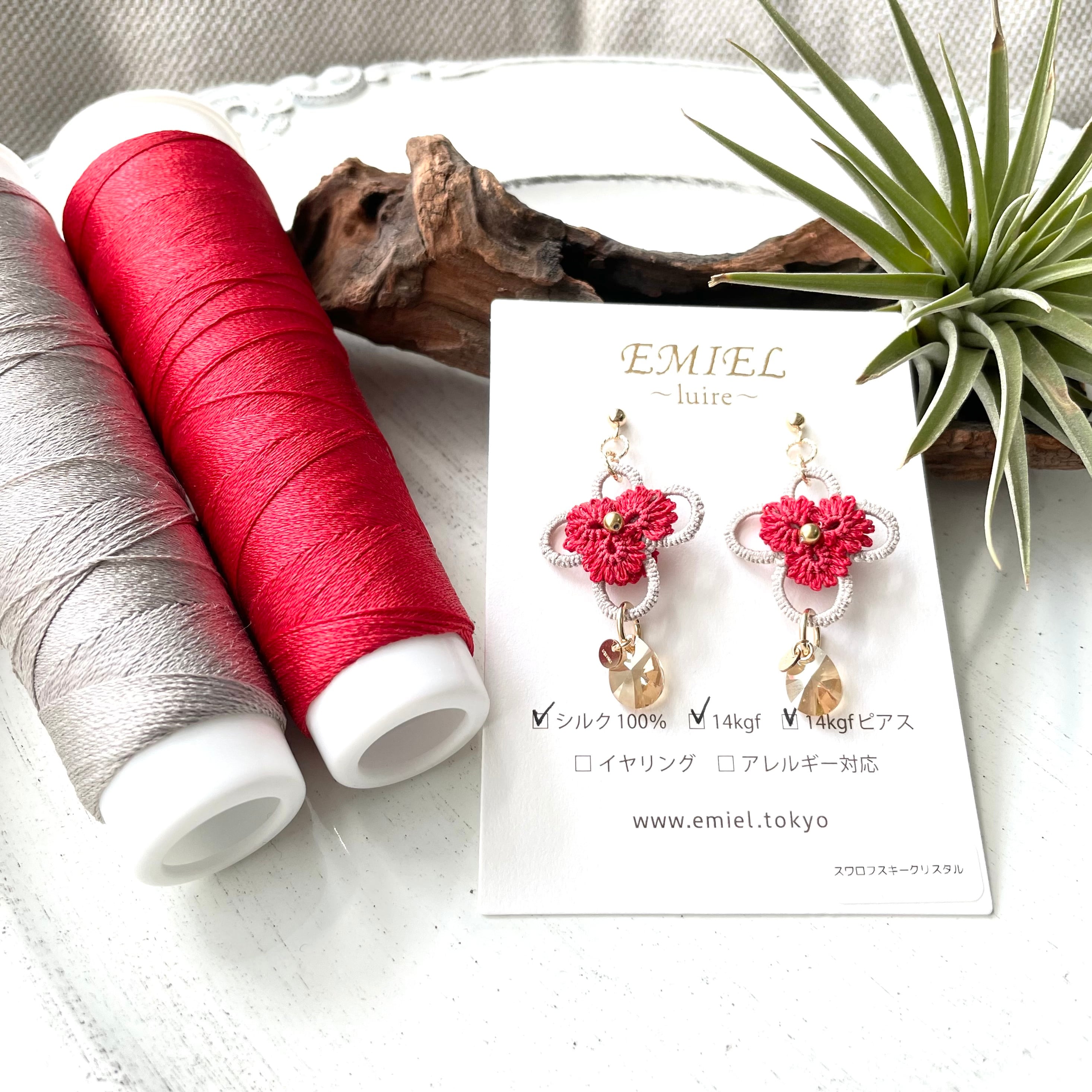 Smile〜luire〜シルク糸*亜麻色・蘇芳色とスワロフスキークリスタルのピアス・イヤリング▶︎ 14kgf使用*国内送料無料